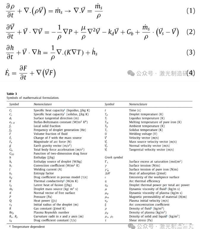 開(kāi)發(fā)了一個(gè)三維笛卡爾模型來(lái)分析TP-GMAW工藝獲得的熔池中的輪廓和對(duì)流。在支持相變能力的計(jì)算域中考慮牛頓和不可壓縮流體的層流。熔池由電磁力、浮力和表面張力共同驅(qū)動(dòng)。為了簡(jiǎn)化數(shù)值模型,等離子體熱對(duì)液滴的影響通過(guò)液滴的初始溫度來(lái)考慮。根據(jù)這些假設(shè),總共四個(gè)控制方程(包括質(zhì)量連續(xù)性、動(dòng)量連續(xù)性(納維爾-斯托克斯)、能量守恒和VOF)根據(jù)方程一起求解。分別為(1)至(4)。表3列出了一系列變量。為了分析熱傳遞和熔池輪廓,采用了FLOW-3D商業(yè)軟件,特別是因?yàn)樵撥浖ㄟ^(guò)拉格朗日VOF平流法跟蹤移動(dòng)的自由表面具有很高的精度。