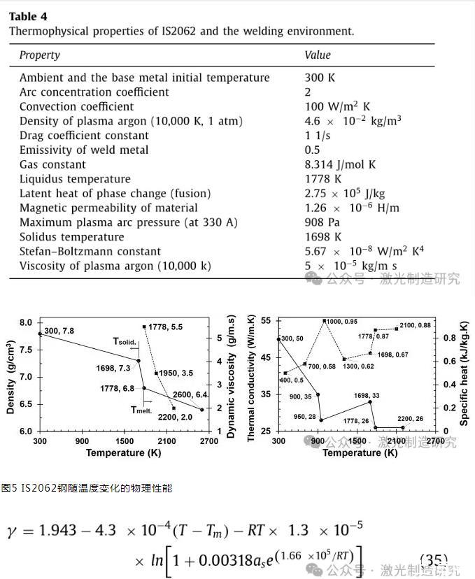 表4顯示了在該模擬中應(yīng)用的IS2062鋼的熱物理性質(zhì)。在溫度相關(guān)條件下考慮了相變和合金元素對(duì)不同物理性質(zhì)的影響(圖5)。這些特性是從不同的數(shù)據(jù)庫(kù)中收集的,包括FLOW-3D的流體數(shù)據(jù)庫(kù)和其他關(guān)于低碳鋼的文獻(xiàn)。自由表面的表面張力被定義為假二元Fe–S系統(tǒng)中溫度和硫含量的函數(shù):