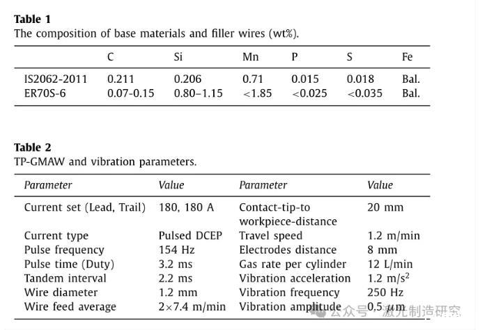 在IIT海得拉巴使用機(jī)器人TP-GMAW設(shè)施進(jìn)行焊接實(shí)驗(yàn),其中兩個(gè)電極分別通過(guò)焊槍饋送并從兩個(gè)獨(dú)立的電源接收電力。電源以反相方式同步,以防止后電弧和前電弧之間的相互作用。氬氣82%–二氧化碳18%用作保護(hù)氣體。機(jī)器人焊接設(shè)備由KUKA公司的KR30六軸機(jī)器人組成,該機(jī)器人與Fronius公司的兩個(gè)數(shù)字焊接電源相連。跟蹤電極和引導(dǎo)電極的電流設(shè)置為180 A.通過(guò)保持焊槍垂直于工件,在平面位置進(jìn)行長(zhǎng)度為200 mm的堆焊。本研究中使用的基材是由鐵素體-珠光體結(jié)構(gòu)組成的熱軋低碳鋼IS 2062-2011。絲狀電極是直徑為1.2毫米的ER 70-S。母材和焊絲的化學(xué)成分列于表1。使用容量為150±0 kgf的Sdyn電動(dòng)振動(dòng)機(jī)來(lái)產(chǎn)生振動(dòng)。