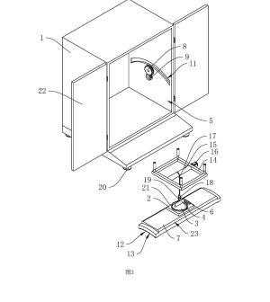 參照圖1,包括殼體1、工作臺2、盛液盒3和標準板4,殼體1內(nèi)設置有工作腔5,殼體1底部設置有多個支撐腳20,在本申請實施例中,支撐腳20設置為四個,四個支撐腳20設置于殼體1的四角位置;殼體1上鉸接有兩轉(zhuǎn)動門22;工作臺2設置于工作腔5內(nèi),工作臺2上開設有與盛液盒3適配的放置槽21,盛液盒3可放置于放置槽21中,標準板4設置于盛液盒3上方,標準板4通過升降結(jié)構(gòu)可升降連接于殼體1上,工作臺2上固定連接有水平儀6,在本申請實施例中水平儀6選用氣泡式水平儀,也可選擇其他體積較小的水平儀;工作臺2和殼體1之間設置有用于調(diào)平工作臺2的調(diào)平結(jié)構(gòu)。