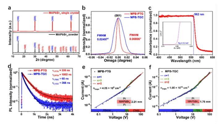 圖3.MAPbBr3鈣鈦礦單晶的表征。(a)粉末XRD和最大面XRD圖譜;(b)XRD搖擺曲線;(c)吸收曲線和禁帶寬度;(d)熒光壽命曲線;(e)和(f)I-V測(cè)試曲線。