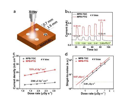 圖4.MAPbBr3單晶探測(cè)器的x射線探測(cè)器。(a)結(jié)構(gòu)圖;(b)光電流響應(yīng);(c)靈敏度;(d)探測(cè)極限。