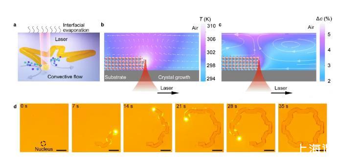 研究者利用COMSOL模擬了激光照射下鈣鈦礦晶體周?chē)木钟蜻^(guò)飽和度,并通過(guò)實(shí)驗(yàn)驗(yàn)證了過(guò)飽和度產(chǎn)生的原理。其中馬倫格尼對(duì)流的引入加速了傳質(zhì)過(guò)程,使得鈣鈦礦結(jié)構(gòu)能夠在激光誘導(dǎo)下快速生長(zhǎng),在實(shí)驗(yàn)中,MAPbBr3鈣鈦礦單晶的生長(zhǎng)速度可達(dá)0.1 mm/s,顯著快于傳統(tǒng)的鈣鈦礦單晶制備方法。激光閾值功率約為150μW,低于現(xiàn)有的激光調(diào)控鈣鈦礦結(jié)晶過(guò)程方法。