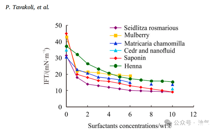 圖3.不同表面活性劑在煤油中作為油相的界面張力:Seidlitzia Rosmarinus、桑葉、洋甘菊、雪松和納米流體、皂角苷(敘利亞棗樹)和指甲花。誤差線表示±5%的標準偏差
