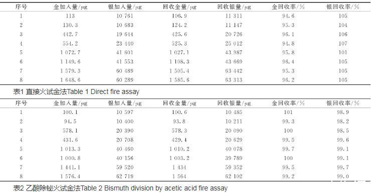 表2結(jié)果為用乙酸除鉍火試金法,再進(jìn)行如表1的實(shí)驗(yàn),從表2可以看出金加標(biāo)回收率99.2%~101%,銀加標(biāo)回收率98.2%~99.7%,說明已消除鉍的干擾,結(jié)果準(zhǔn)確可靠。