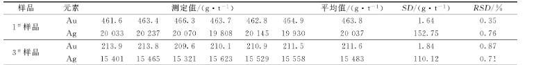 選取兩個(gè)粗鉍樣品,1#和3#樣品進(jìn)行實(shí)驗(yàn),稱取2.000 g粗鉍樣品,按照以上實(shí)驗(yàn)方法進(jìn)行實(shí)驗(yàn),每個(gè)樣品做了6次平行實(shí)驗(yàn),結(jié)果如表7所示,金相對(duì)標(biāo)準(zhǔn)偏差(RSD)為0.35%~0.87%,銀相對(duì)標(biāo)準(zhǔn)偏差(RSD)為0.76%~0.71%。