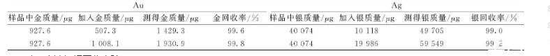 稱取兩份2.0 g(精確至0.000 1 g,金含量463.8 g/t,銀含量20 037 g/t)粗鉍樣品,分別加500、1 000μg金和10 000、20 000μg銀,按照實(shí)驗(yàn)方法氧化、除鉍、火法富集,進(jìn)行分析,測(cè)得金銀含量和加標(biāo)回收率見表6。