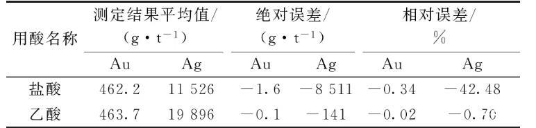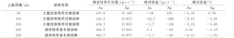 實(shí)驗(yàn)樣品金含量463.8 g/t,銀含量20 037 g/t,進(jìn)行除鉍用酸量的實(shí)驗(yàn),試驗(yàn)用酸為乙酸(1+1),結(jié)果見表5,從結(jié)果可以看出50、100 mL乙酸用量,大部分固體物質(zhì)沒被溶解,大部分鉍沒被除去,乙酸用量200 mL時(shí),固體物質(zhì)基本被溶解,結(jié)果較準(zhǔn)確,可以滿足測(cè)定要求。在結(jié)果準(zhǔn)確的情況下選擇用量少的,所以實(shí)驗(yàn)選擇乙酸用量為200 mL。