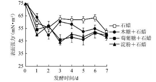 圖1碳源對(duì)發(fā)酵液表面張力的影響