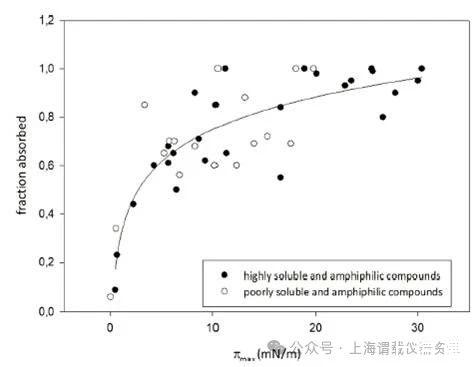 本論文研究人員提出了一種藥物活性分子生物利用度(fa)快速篩選方法-表面活性譜(SAP),作為替代傳統(tǒng)的動物研究和細胞培養(yǎng)篩選。研究人員使用SAP技術(shù),主要是基于Kibron公司的高通量表面張力分析儀----(Delta-8),該儀器只需要50ul原液就能進行完整的滲透率分析。并將溶液中化合物的表面活性譜化合物與生物膜相互作用或穿透生物膜的潛力聯(lián)系起來。用于這種關(guān)聯(lián)的進一步參數(shù)包括臨界膠束濃度(CMC)、界面空氣/水分配系數(shù)(KAW?1)和分子在界面的面積要求,即截面面積(AS)等這些表面活性參數(shù)來獲取藥物的生物利用度(fa值)。此方法的提出對于先導(dǎo)化合物的早期篩選研究,因為先導(dǎo)化合物只有少量的化合物可用,SAP方法似乎是一個很有效和快速的工具,可以準確預(yù)測兩親性化合物的fa值,為新藥研發(fā)提供了重要的技術(shù)支持,這也說明高通量的表面張力分析儀(delta-8)在藥物研發(fā)方面發(fā)揮了重要的作用,尤其是預(yù)測活性藥物分子的生物利用度(fa)提供了一種新的技術(shù)手段。