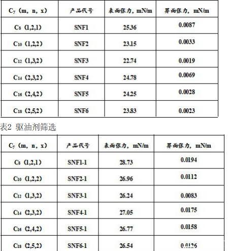 制得的驅(qū)、滲一體化驅(qū)油劑(SNF1至SNF6)的表面張力和界面張力,測(cè)試條件:60℃、5000rpm,濃度均為0.2%,測(cè)試結(jié)果見(jiàn)表1。表1中,y是驅(qū)、滲一體化驅(qū)油劑的親油碳鏈主鏈長(zhǎng)度,m是對(duì)苯乙烯磺酸鈉的反應(yīng)系數(shù),n是丙烯酰胺的反應(yīng)系數(shù),x是氟碳陽(yáng)離子疏水單體的反應(yīng)系數(shù)。
