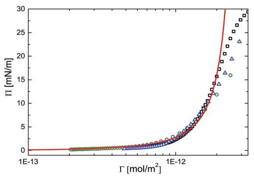 圖 2 表面壓力(P)與吸附的 PNIPAM 顆粒量 (G) 在空氣-水界面上。 開放符號表示實驗 對應于三組不同實驗的數據點 即:(,)具有高初始粒子負載的 NIMA 槽,(B)NIMA 低初始粒子負載的槽和 (D) Kibron m 槽 高初始粒子負載。 紅色實線表示預測 使用 Groot 和 Stoyanov 模型制作。