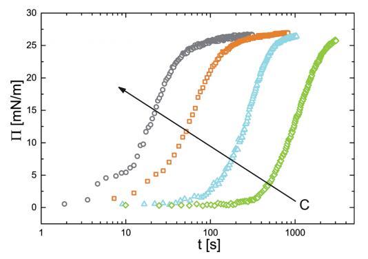 已經建立了一個狀態方程來關聯 表面壓力和吸附量,我們現在繼續 研究顆粒的吸附動力學。 為此我們 監測新鮮的界面張力的演變 在 PNIPAM 顆粒懸浮液中制備氣泡作為 時間的函數。 我們轉換界面張力值 轉化為表面壓力。 結果如圖 4 所示。 表面壓力值最初迅速增加,然后 放松到最終的平衡值。 動態可以一目了然 分為兩個獨立的時間尺度:初始快速 由表面壓力增加表示的動力學 值,以及隨著系統向最終放松而緩慢的部分 平衡狀態。 快速動力學之間的這種區別 短時間和長時間慢得多的動力學是許多表面活性物質的吸附行為的特征 材料.32,33
