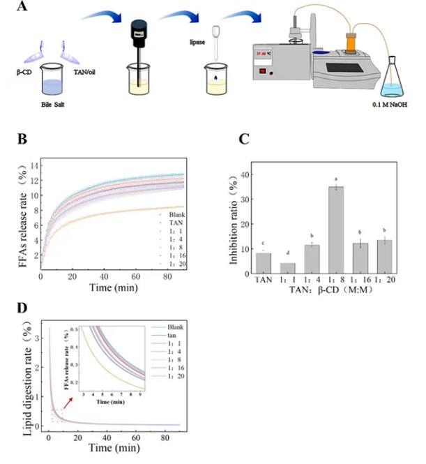本研究發現橘皮素(TAN)和β-環糊精(β-CD)的相互作用會導致膽鹽在油水界面處過度聚集,阻礙脂肪酶水解產生游離脂肪酸的釋放。此外,膽鹽和脂肪酶在液滴之間的置換速率降低,從而導致液滴可用于脂肪酶吸附的界面面積減少。因此,脂質消化被有效抑制。這些結果表明,表面活性抑制劑可以改變油水界面的組成、厚度和穩定性,從而抑制脂質消化。然而,TAN與β-CD相互作用形成的復合物及其與膽鹽結合后的結構和共組裝特性有待進一步研究。本研究從界面角度揭示TAN和環糊精在脂質消化中的作用機制,為香料分子和環糊精的健康食品開發提供理論支持。