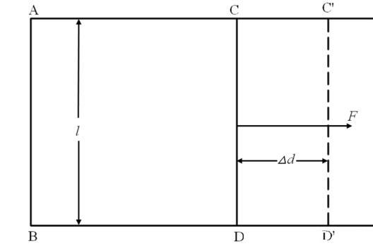 研究液體表面張力隨液體濃度、溫度、壓強(qiáng)等的變化規(guī)律的論著很多,卻很少有人研究液體表面張力隨液面拉伸程度的變化規(guī)律,從而隱喻了一種結(jié)論,即液體在濃度、溫度、壓強(qiáng)等條件不變時,其表面張力的大小不會隨其表面被拉伸的程度而改變。多部專著都有這樣的經(jīng)典的論述,圖1所示的矩形金屬絲框覆有液膜,其中CD為活動邊,長為l,欲使體系平衡,必須施以適當(dāng)?shù)牧于CD邊上。CD邊在力F作用下克服液膜表面張力的阻礙而移動距離Δd,對體系做功ΔA=F×Δd,F(xiàn)=2γ×l,γ=F/2l為CD邊的液體表面張力系數(shù)。在此論述中,先驗(yàn)地將液體表面張力視為不隨液膜面積變化而改變的恒量。