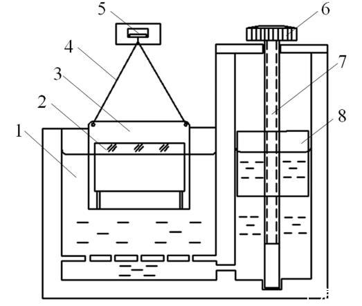 新型表面張力測試儀基本結(jié)構(gòu)如圖2所示,該儀器盛有液體(1),儀器采用連通器結(jié)構(gòu),截面積較大的左端放置拉力框(3),截面積較小的右端設(shè)有升降塊(8),旋動栓鈕(6)和螺桿(7),可使升降塊(8)上升或下降,從而引起液面相應(yīng)的但速度更緩慢的升降。為減小液面升降時的波動,容器的兩端通過若干均勻分布的小孔相連通。為便于觀測液面位置,容器壁采用透明的有機(jī)玻璃材料,通過讀數(shù)顯微鏡確定液面高度。