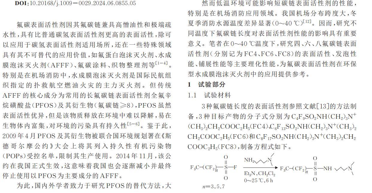 然而低溫環境可能影響短碳鏈表面活性劑的性能,特別是在機場消防應用領域。我國機場分布跨度大,冬夏季消防水源溫度差異顯著(0~40℃)。因而,研究不同溫度下氟碳鏈長度對表面活性劑性能的影響具有重要意義。筆者在0~40℃溫度下,研究四、六、八氟碳鏈表面活性劑(分別記為FC4、FC6、FC8)的表面活性、發泡性能、鋪展性能等主要理化性能,為氟碳表面活性劑在環保型水成膜泡沫滅火劑中的應用提供參考。