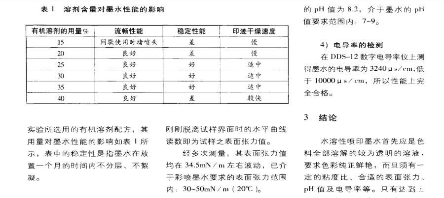噴墨墨水中有機(jī)溶劑的成分及所占的比例對(duì)墨水的性能影響非常大。一般情況下,溶劑的用量是墨水重量的10%-50%。當(dāng)溶劑含量低于10%時(shí),作用不明顯,超過50%時(shí)有些染料則無法溶解。
