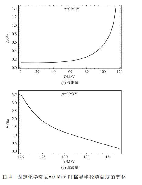 進一步,本文對式(12)、(16)進行了數值求解,得到了氣泡解和液滴解的表面張力及臨界半徑在μ=0 MeV時隨溫度變化的曲線,如圖3和4.式(10)是非線性方程,難以解析求解。以往研究者的文章中曾利用薄壁近似進行解析求解進而得到氣泡表面張力隨溫度減小而單調減小的結果。但本文的數值結果圖3(a)表明,在溫度從臨界溫度開始減小時,表面張力會先增加。當溫度到達T=109 MeV附近時,表面張力達最大值,然后再隨溫度減小而單調減小。而我們知道嚴格來說薄壁近似只在臨界溫度處適用,這里表面張力的非單調變化表明在偏離臨界溫度時,薄壁近似結果是會明顯偏離嚴格數值計算結果的。這一結果與以往研究者結果是一致的。