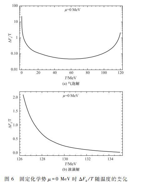對于液滴解,ΔFb/T的值在靠近臨界溫度時也是迅速增加,而當溫度遠離臨界溫度時逐漸減小。造成這兩者變化的主要不同在于亞穩態是否會消失,對于氣泡解從圖1有效勢的變化可以看出即使到零溫,亞穩態仍然不會消失,所以ΔFb/T的值會在接近零溫時快速變大并趨于發散,但是從描述相變的角度來看遠離臨界溫度的氣泡解已經不再具有真實的物理意義。這與以往文獻中對于此模型研究的數值結果是一致的。而對于液滴解情形有效勢亞穩態會在溫度升高到Tsp=142.8 MeV時消失,Tsp這個溫度稱為亞穩態分解(Spinodal)溫度,此時液滴解不再存在,ΔFb/T的值變為0.