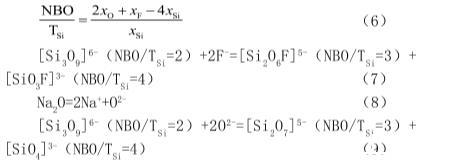 熔體表面張力與熔渣結構的聚合程度密切相關。連鑄結晶器保護渣屬于硅酸鹽,硅酸鹽熔體中含有不同聚合程度的硅氧陰離子團。熔渣結構的聚合程度用符號“NBO/TSi”表示,其計算公式如式(4)所示。NBO/TSi值越小,說明熔體聚合程度越高。將預熔渣和靜滴法測定后的渣樣成分分別帶入到式(6)中,計算結果如表2所示。從表中可以看出,靜滴法測定后渣樣的NBO/TSi值小于預熔渣的NBO/TSi值,說明靜滴法測定后的渣樣熔體結構聚合程度高于預熔渣熔體結構聚合程度。這是由于F-能降低熔渣結構的聚合程度,將高聚合程度的硅氧陰離子團逐漸解聚成低聚合程度的硅氧陰離子,同時Na2O電解出O2-,O2-的出現(xiàn)亦可降低熔體的聚合程度,反應式見(7)~(9):