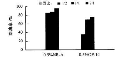 從圖2的脫附除油率來看,當納米乳液濃度在0.5%時,除油效果最佳,脫附除油率達到95.7%;當納米乳液濃度達到5%時,脫附除油下降一半,說明濃度過高的納米乳液反而降低了它的脫附除油效果;在低濃度下(0~1%),納米乳液和含油廢物按劑固比為2∶1處理含油廢物時,脫附效果優于劑固比為1∶1的脫附效果。將0.5%的納米乳液NR-A與同濃度下的OP-10進行脫附除油對比,實驗結果如圖3所示。從圖3的脫附除油率可以看出,當劑固比為1∶2時,納米乳液NR-A的脫附除油率(85.49%)是OP-10(34.73%)的2倍多;當劑固比達到2∶1時,納米乳液NR-A的脫附除油率(95.74%)仍比OP-10(74.1%)高出20%。由此說明納米乳液NR-A的脫附除油效果遠遠超過常規表面活性劑。