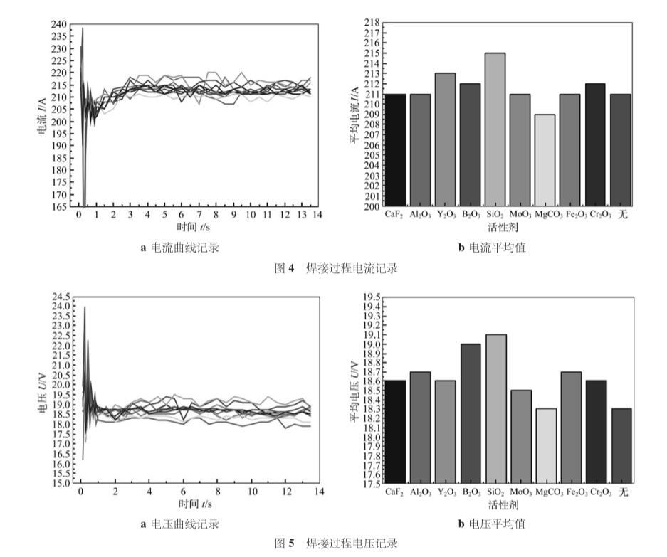 圖4為焊接過程中電流的記錄。從圖4a可以看出,焊接過程中各單一活性劑焊接電流曲線基本相似,從圖4b可以看出,大部分活性劑焊接過程的平均電流與無活性劑時(shí)相差不大,SiO2和MgCO3的電流平均值相比無活性劑時(shí)有較為明顯的變化,其中前者增加,后者減小。無活性劑時(shí)的平均電流達(dá)到211.5 A,而涂SiO2可以達(dá)到215 A。