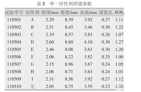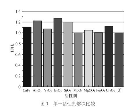 單一活性劑焊縫參數(shù)及無活性劑時(shí)焊縫參數(shù)如表2所示,表2單一活性劑焊縫參數(shù),圖1是單一活性劑熔深與無活性劑時(shí)熔深比直方圖。