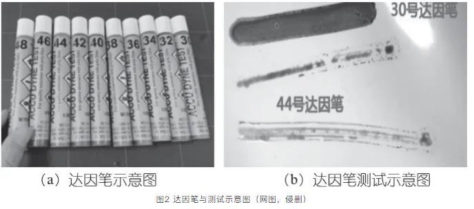 測試前先確定環境溫度、空氣濕度、以及被測物體表面溫度是否達到達因筆標定的標準條件(溫差越大,測量誤差越大)。測試方法圖2(b)所示塑料袋張力測試,當30mN/m筆測試時,在2 s內達因筆潤濕了基材表面,沒有收縮或分散情況,說明表面張力等于或大于30 mN/m;當44 mN/m筆測試時,在2 s內達因筆沒有潤濕了基材表面,出現收縮或分散水珠情況,說明表面張力小于44 mN/m。還可用大于30 mN/m筆測量,以此類推,直到測試結果在2 s內改縮成水珠(球狀),則這測試之前一次的值被視為基材表面能,并作比較用。塑料袋PP材質在溫度20℃時表面張力是31~33 mN/m。達因筆使用方便,保質期為6個月。
