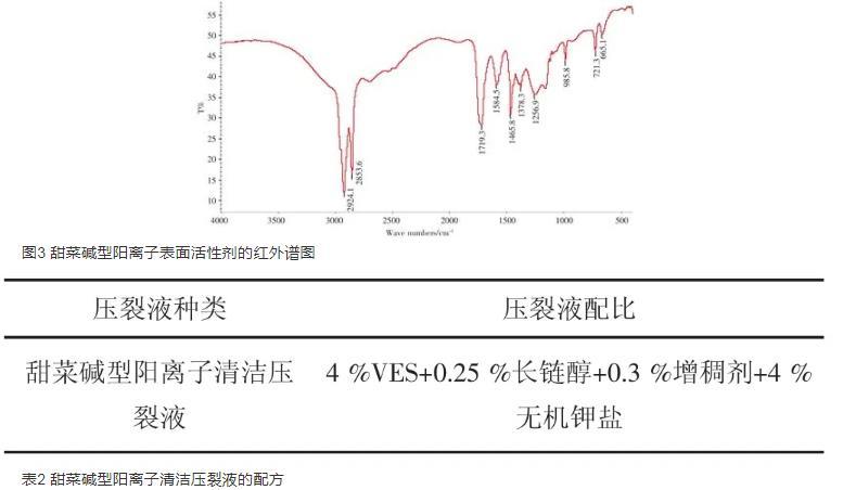 甜菜堿陽離子壓裂液體系中主劑是甜菜堿陽離子表面活性劑;使用無機鉀鹽作為促進表面活性劑成為膠束,并有防膨及黏土穩定作用;增稠劑使用天然的高分子材料,既有增稠的作用又有降濾失作用。