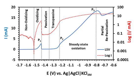 圖1電化學線性掃描伏安圖(LSV,藍色實線)及液滴電流的對數圖(紅色虛線),針對1 M NaOH中的鎵銦合金,掃描速率為0.5 mV/s。垂直虛線將圖中標記的六個反應區域區分開來,標記出三個氧化峰P1、P2和P3。