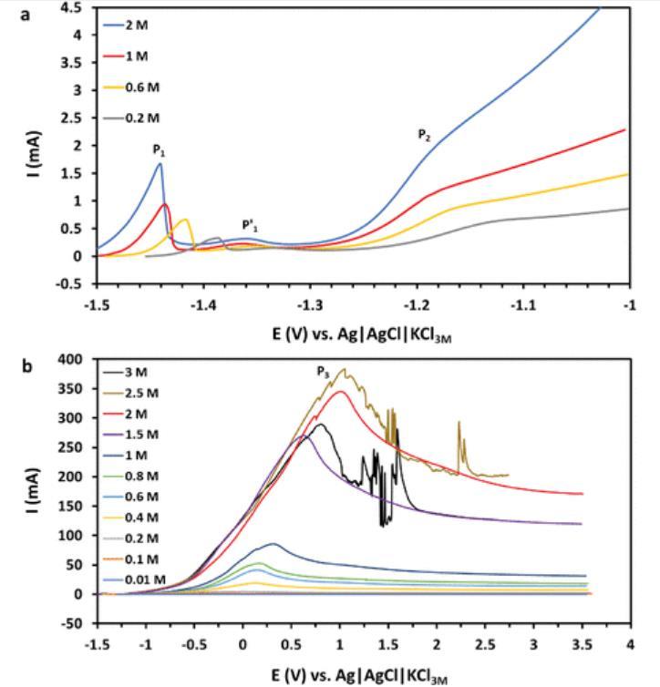 圖4(a)鎵銦合金在不同濃度NaOH中的近鈍化區伏安圖。(b)鎵銦合金在不同濃度NaOH中的完整線性掃描伏安圖,掃描速率為100 mV/s。