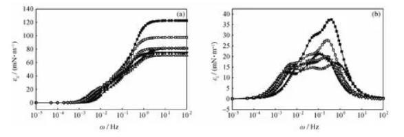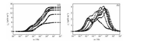 當頻率較低時,界面張力梯度在實驗時間內幾乎可以完全消除,由于界面形變所造成的能量變化幾乎完全耗散在環境中,對擴張模量的貢獻可以忽略,εi接近于零;當頻率較高時,各種弛豫過程來不及發生,對擴張模量的影響也可以忽略,εi仍然接近于零;只有在適宜的頻率范圍內,εi隨頻率變化而變化,并在其弛豫過程的特征頻率處出現極大值。
