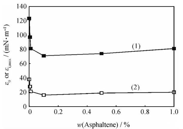 圖8含不同量瀝青質的煤油-1750mg/L HMPAM水溶液體系的極限擴張彈性(ε0)和擴張黏性最大峰值(εi,max)