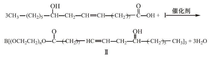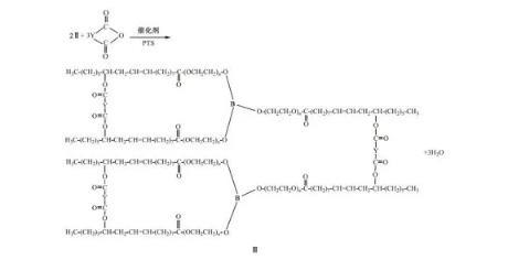 待反應液冷卻至50℃,向反應液中加入0.12 mol蓖麻油酸與催化劑對甲基苯磺酸(PTS的質量為蓖麻油、聚乙二酸與硼酸總質量的1%),升溫至140℃,在負壓下進行反應,至體系酸值不變,酯化過程如下所示: