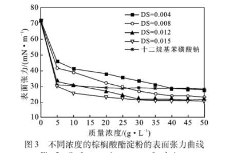 2.1.3淀粉的表面活性棕櫚酸酯淀粉糊液的表面張力測定結果見圖3。