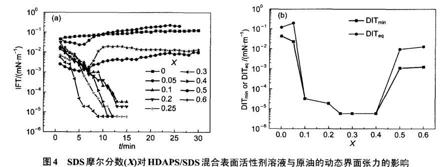 圖4 SDS摩爾分數(shù)(X)對HDAPS/SDS混合表面活性劑溶液與原油的動態(tài)界面張力的影響