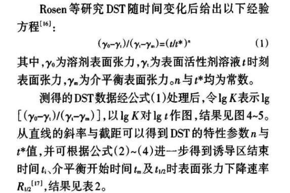 其中,γ0為溶劑表面張力,γt為表面活性劑溶液t時刻表面張力,γm為介平衡表面張力。n與t*均為常數(shù)。