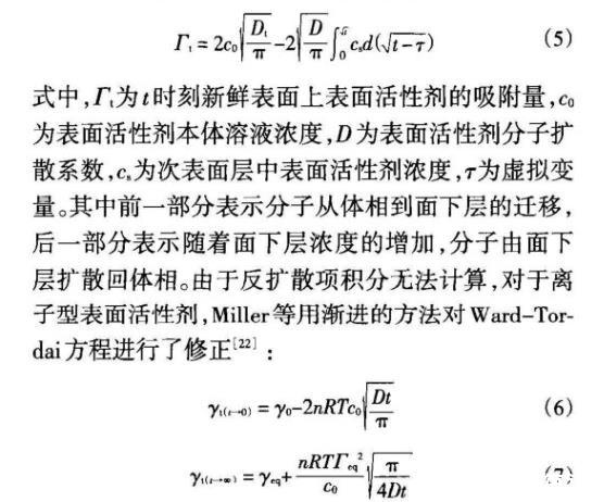 表面活性劑分子在新鮮表面上的吸附分兩步進行:(1)分子從本體溶液到次表面的遷移;(2)分子在次表面和表面間的吸附平衡。在動態(tài)吸附模型的基礎(chǔ)上提出了兩種主要的動態(tài)吸附機理:擴散控制吸附、混合動力控制吸附。