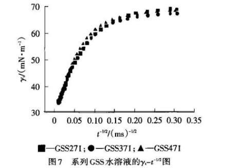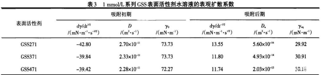 在吸附初期,GSS271的擴散系數(shù)最大,表明較容易擴散到次表面,這與在相同濃度下Rosen模型處理的n值最小吻合;在吸附后期,GSS471的擴散系數(shù)最大,這與其柔性連接鏈扭曲變形而在表面定向排列緊密相關(guān),且與Rosen模型處理的t*值最大吻合。