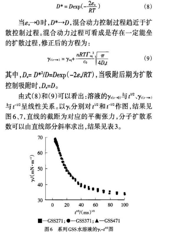 從表3可知,吸附初期GSS的擴散系數(shù)較吸附后期大2~3個數(shù)量級。表明GSS分子自本體溶液擴散到次表面的速度遠大于在氣液界面與次表面之間的交換速度,因為在吸附初期(t→0),新鮮表面不存在吸附勢壘,屬擴散控制吸附;吸附后期(t→∞),在氣液界面吸附的GSS分子由于相互作用產(chǎn)生的位能壘、離子頭基間的靜電斥力以及分子的定位重排等共同作用導致了混合動力擴散控制。