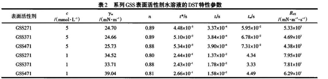 以GSS271為例,濃度越高,表面活性劑分子的擴散推動力越大,于氣液界面吸附越快,DST下降越顯著,因而誘導區(qū)結(jié)束的時間越早,越易達到介平衡,這與γm、ti、tm較小吻合;t*值隨濃度增大而減小,表明吸附后期勢壘隨濃度增大而增大,因為濃度較高時,更多的GSS271分子吸附于表面,由于空間位阻、分子間靜電斥力的影響,阻礙了新的GSS271分子吸附,吸附勢壘變大。濃度高時,R1/2大,動態(tài)表面活性好。