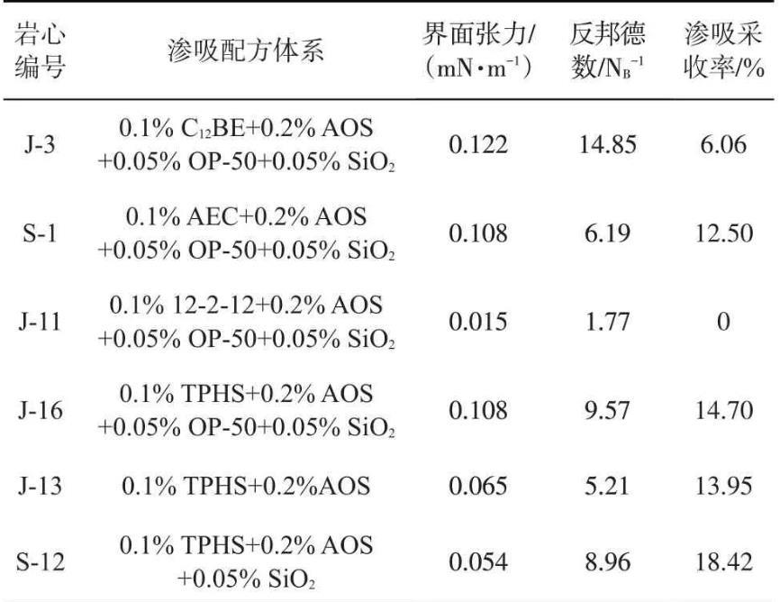 為驗證TPHS活性納米流體在滲吸采收率的應(yīng)用,采用靜態(tài)滲吸實驗開展TPHS及常見表面活性劑復(fù)配溶液滲吸效果對比研究,巖心的基本物性參數(shù)見表2,不同體系與原油間的界面張力、所計算的反邦德數(shù)和滲吸采收率結(jié)果見表3,結(jié)果表明在滲吸過程中毛管力起主導(dǎo)作用。
