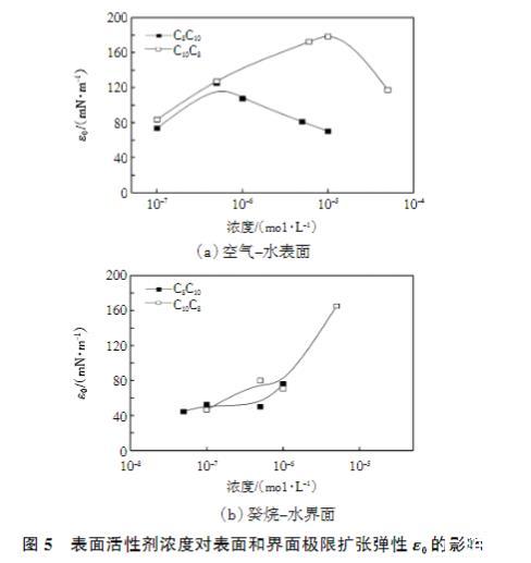 圖5表面活性劑濃度對表面和界面極限擴張彈性ε0的影響