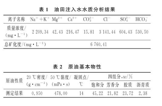 (1)主要材料。脂肪醇聚氧乙烯醚硫酸鈉、十二烷基苯磺酸鈉、十二烷基硫酸鈉,成都科龍化工試劑廠生產(chǎn);十六烷基二甲基甜菜堿、烷基糖苷APG1214,臨沂綠森化工有限公司生產(chǎn),上述藥品均為工業(yè)級。實驗用水為油田注入水,水質(zhì)分析結(jié)果見表1;實驗用油為X油田原油,其基本物性見表2。