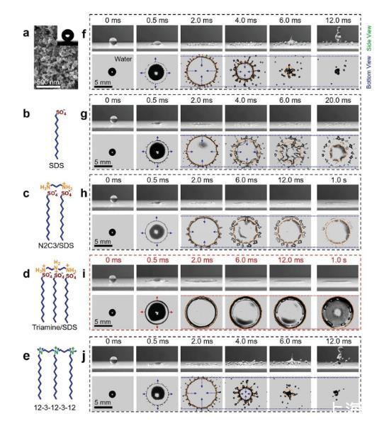 圖1.高速液滴撞擊超疏水表面的動態(tài)行為。a)掃描電子顯微鏡(SEM)揭示了表面的微觀結(jié)構(gòu)。插圖:水接觸角為161.3±1.1°,確保超疏水性。b–e)表面活性劑的分子結(jié)構(gòu)。f)撞擊超疏水表面的水滴出現(xiàn)飛濺和反彈。g–j)分別含有SDS、N2C3/SDS、三胺/SDS和12-3-12-3-12添加劑的水滴在超疏水表面上的撞擊動力學(xué)的側(cè)面和仰視圖。g,h)含有SDS或N2C3/SDS添加劑的液滴抑制了反彈,但仍會產(chǎn)生飛濺或后退破碎。i)含有三胺/SDS的液滴一旦與基材接觸就會形成穩(wěn)定的周邊邊緣,隨后完全沉積在超疏水表面上而不會發(fā)生任何飛濺或碎裂。完全均勻的潤濕膜在達(dá)到最大擴散面積后保持不變。j)合成低聚表面活性劑12-3-12-3-12添加劑對水滴的影響影響不大。濺射和反彈仍然會發(fā)生。箭頭的長度表示擴散或反彈速度的變化。