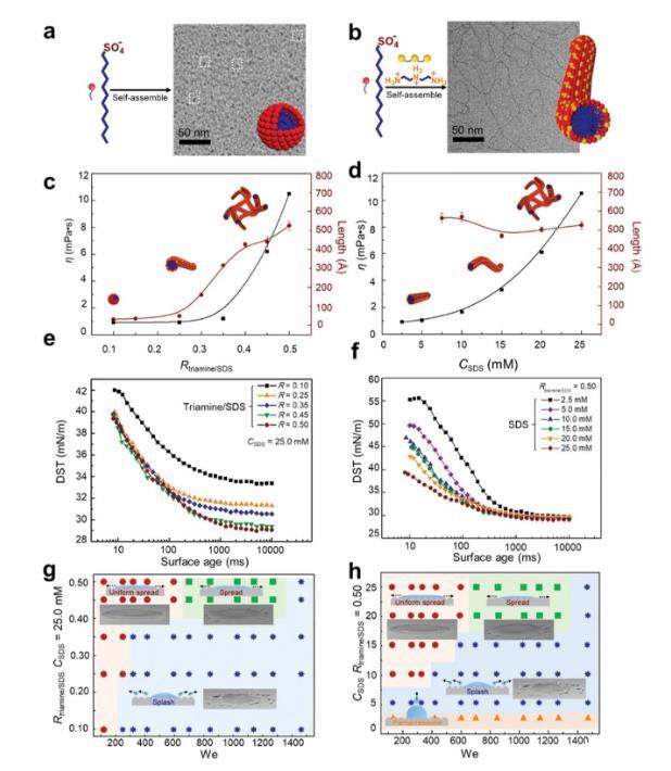 圖2.撞擊結(jié)果的物理化學(xué)性質(zhì)和相圖。a,b)SDS和三胺/SDS聚集狀態(tài)的示意圖和低溫透射電鏡圖像。a)單獨的SDS形成小的球形膠束,用虛線矩形突出顯示。b)加入三胺后,三胺/SDS形成長而密集的纏結(jié)線性膠束。c,d)在不同摩爾比R和摩爾濃度CSDS下三胺/SDS的粘度和聚集長度。在臨界摩爾比或摩爾濃度之后,膠束伸長并纏結(jié)成網(wǎng)絡(luò)結(jié)構(gòu),導(dǎo)致粘度急劇增加。e,f)不同R和CSDS下三胺/SDS的動態(tài)表面張力(DST)曲線。隨著R和CSDS的增加,初始和平衡表面張力均顯著降低。g,h)不同We數(shù)下三胺/SDS液滴撞擊超疏水表面的動態(tài)行為相圖。在高We下,含有三胺/SDS添加劑的液滴只有在特定的摩爾比(0.45–0.50)和特定的摩爾濃度(>20.0×10?3 m)下才能完全沉積在超疏水表面上。