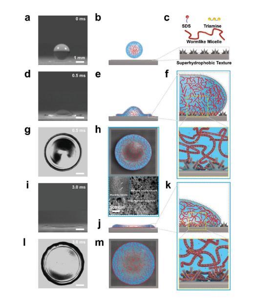 圖3.活性低聚表面活性劑高速撞擊超疏水表面后均勻鋪展的示意圖。a、b)液滴包含三維纏結(jié)的蠕蟲狀膠束網(wǎng)絡(luò)。c)SDS、三胺、蠕蟲狀膠束和具有微/納米結(jié)構(gòu)的超疏水表面的示意圖。d–h)表面活性劑分子快速擴散到新形成的界面,并緊密堆積在水-空氣界面。蠕蟲狀膠束被迫伸展以固定水。在快速擴散過程中,擴散邊緣穩(wěn)定且均勻。h)蠕蟲狀膠束的密集網(wǎng)絡(luò)纏繞著基底的微納米結(jié)構(gòu),三胺/SDS液滴撞擊后的低溫掃描電鏡圖像支持了這一觀點,其中較大的圖像顯示了較小圖像底部的網(wǎng)絡(luò)。f)表面活性劑分子與基質(zhì)具有很強的相互作用,蠕蟲狀膠束網(wǎng)絡(luò)與基質(zhì)的微/納米結(jié)構(gòu)纏繞在一起。i–m)在最終平衡狀態(tài)下,致密的蠕蟲狀膠束存在于擴散外圍并與微/納米結(jié)構(gòu)纏繞在一起。左欄中所有液滴的比例尺均為1毫米。