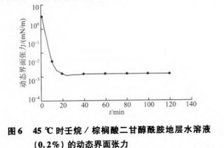 圖6 45℃時壬烷/棕櫚酸二甘醇酰胺地層水溶液(0.2%)的動態(tài)界面張力