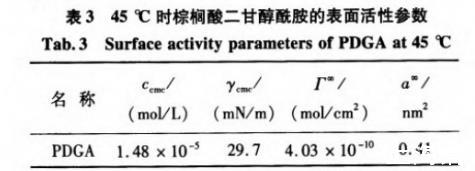 表3 45℃時棕櫚酸二甘醇酰胺的表面活性參數(shù)